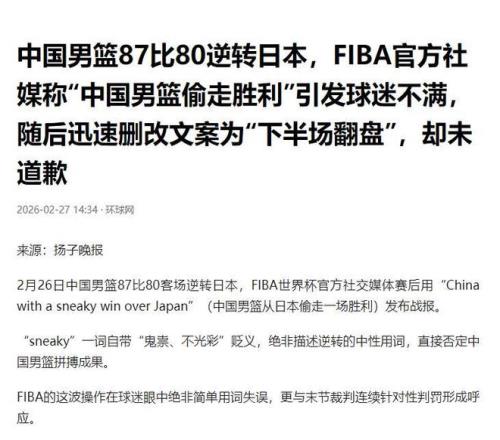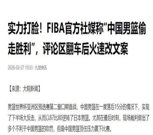 2月26日,中國男籃在世界杯預(yù)選賽上以87:80擊敗了日本隊。