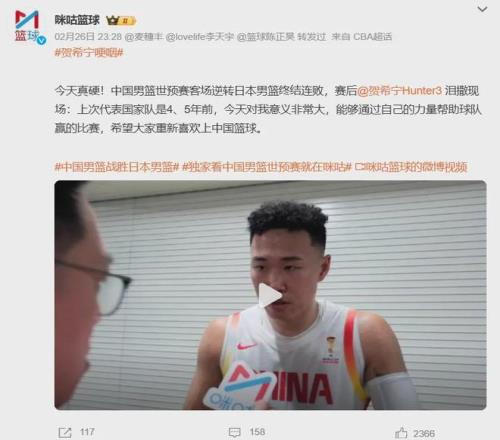 賽后接受采訪時,賀希寧動情落淚,表示這場比賽對他意義重大,希望可以讓大家重新喜歡上中國籃球。