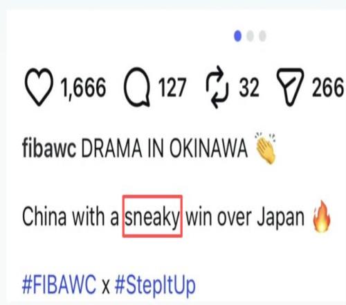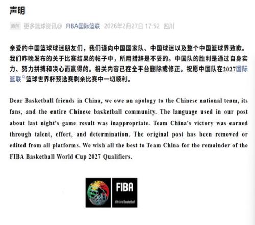 2月26日中國男籃在沖繩客場87比80逆轉(zhuǎn)日本隊后,F(xiàn)IBA籃球世界杯官方社媒賬號在戰(zhàn)報里寫下“China with a sneaky win over Japan”(“sneaky”在英語里帶著“鬼鬼祟祟、不光彩”的暗示,多家媒體譯作“偷走一場勝利”),隨即引發(fā)輿情。相關(guān)帖文隨后被刪除;2月27日,F(xiàn)IBA在其官方微信發(fā)布中英雙語致歉,明確向中國國家隊、中國球迷以及中國籃球界致歉,承認(rèn)措辭不妥,并強(qiáng)調(diào)中國隊勝利來自實力、拼搏與決心。