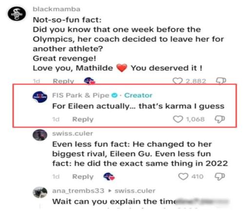 冬奧會期間,國際滑雪和單板滑雪聯(lián)合會(FIS)也踩過同樣的“雷”。FIS旗下官方TikTok賬號“FIS Park & Pipe”在一條關(guān)于瑞士選手瑪?shù)贍柕隆じ窭啄聤Z得女子坡面障礙技巧金牌的視頻評論區(qū),先有網(wǎng)友拋出所謂“不那么有趣的事實”,聲稱格雷莫德的教練在冬奧前一周“離開她去帶另一名運動員”,并把奪金形容為“復(fù)仇”“是你應(yīng)得的”。該官方賬號隨后竟跟評稱:“對谷愛凌而言……我猜這就是所謂的‘因果報應(yīng)’。”把谷愛凌未能奪金輕飄飄地歸因為“karma”(常被理解為“現(xiàn)世報”)。事件引發(fā)外界強(qiáng)烈不滿后,相關(guān)評論被刪除;據(jù)報道,F(xiàn)IS也就此致歉。