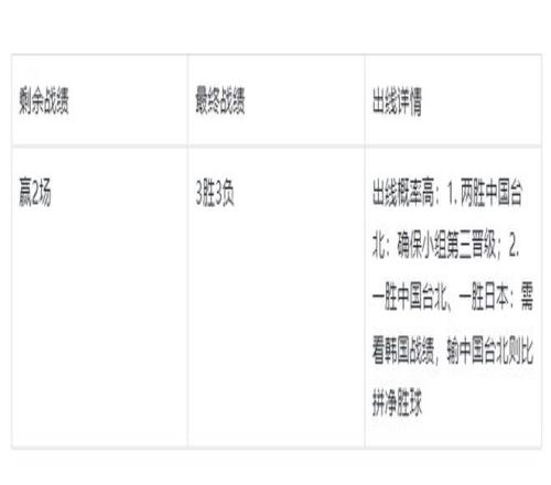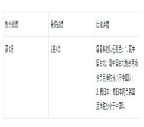 中國(guó)隊(duì)的1勝若贏在中國(guó)臺(tái)北男籃身上,日本男籃則會(huì)至少3勝晉級(jí),中國(guó)隊(duì)想要晉級(jí)就必須滿足中國(guó)臺(tái)北男籃剩余兩場(chǎng)全輸(韓國(guó)也能3勝晉級(jí)),且凈勝分小于中國(guó)隊(duì)。