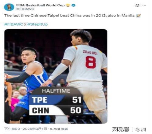 本場比賽,中國男籃上半場50-51落后中國臺北,F(xiàn)IBA世界杯官方賬號已經(jīng)蠢蠢欲動,列出上一次中國臺北擊敗中國男籃的歷史:2013年,也是在馬尼拉!