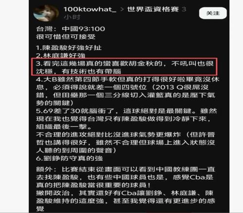 沒(méi)錯(cuò),讓臺(tái)北球迷印象最深的就是國(guó)家隊(duì)的胡金秋,有臺(tái)北球迷表示最喜歡胡金秋,他們說(shuō):“.看完這幾場(chǎng)真的蠻喜歡胡金秋的,不吼叫也很沉穩(wěn),有技術(shù)也有帶腦?!睂?shí)際就是贊胡金秋技術(shù)好,人品好,球商好。