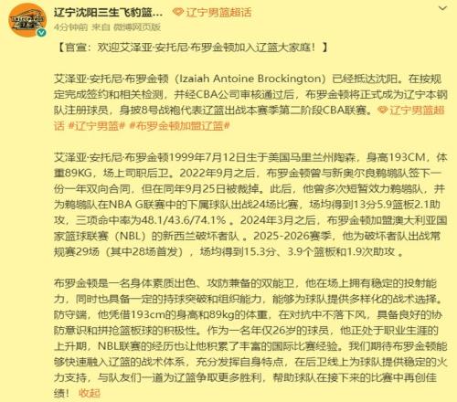 上午9點(diǎn)官宣!遼籃正式與布羅金頓簽約,期待他在第二階段的表現(xiàn)!北京時(shí)間3月6日上午9點(diǎn),遼籃正式官宣與新援布羅金...