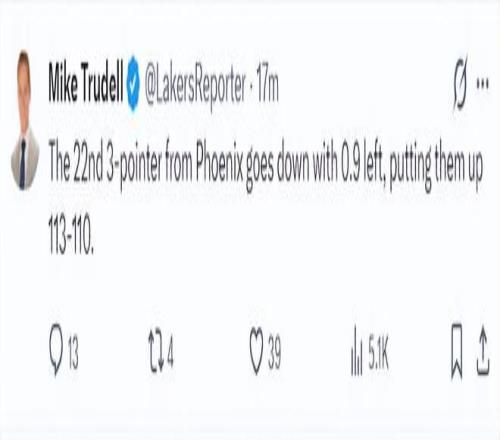 湖人隊(duì)記邁克-特魯戴爾:在終場(chǎng)前0.9秒湖人居然讓殘陣太陽(yáng)命中第22個(gè)三分球。