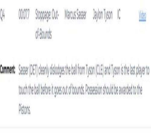 第三次也是錯(cuò)判,發(fā)生在距離第四節(jié)結(jié)束還有7.7秒?;钊乃_瑟干凈地從泰森手中斷球,泰森是球出界前最后觸球的球員。球權(quán)應(yīng)判給活塞隊(duì)。但裁判判給了騎士,這是一次錯(cuò)誤的判罰,活塞吃虧,騎士獲利。