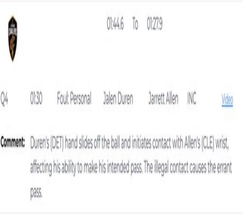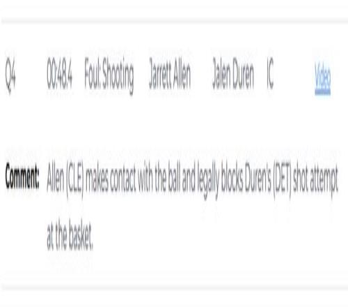 第二次是錯(cuò)判,發(fā)生在距離第四節(jié)結(jié)束還有48.4秒。艾倫在封蓋杜倫時(shí),手碰到的是球,這是一次沒(méi)有犯規(guī)的封蓋,但裁判吹了艾倫防守犯規(guī),給了杜倫兩次罰球機(jī)會(huì)。這是一次錯(cuò)誤的判罰,依然是活塞獲利,騎士吃虧。