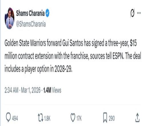 在湖勇焦點(diǎn)戰(zhàn)開打前,名記Shams曝出勇士提前以一份3年1500萬美元合同續(xù)約了桑托斯,合同包含28-29賽季球員選項。