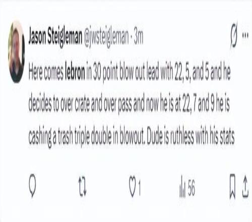 這場比賽美記Jason Steigleman寫道:勒布朗在湖人領(lǐng)先30分時還登場,當時他的數(shù)據(jù)是22+5+5,他還是決定登場刷數(shù)據(jù),他希望在一場大比分領(lǐng)先的情況下刷三雙,這家伙真是對數(shù)據(jù)非常癡迷。