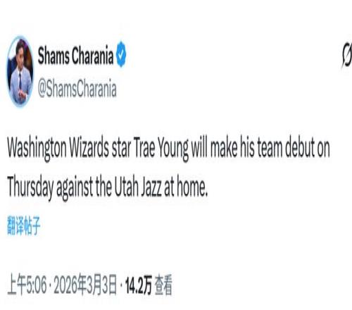 北京時(shí)間3月3日,據(jù)名記Shams報(bào)道,華盛頓奇才隊(duì)控球后衛(wèi)特雷-楊預(yù)計(jì)將在周五對(duì)陣猶他爵士的比賽中完成新球隊(duì)首...