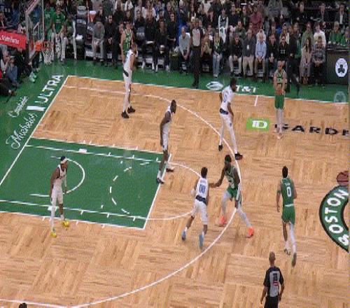 這是塔圖姆這場(chǎng)比賽跟杰倫·布朗的第一次互動(dòng),它來的很早,第一節(jié)8分28秒。開場(chǎng)的塔圖姆每個(gè)球都在找隊(duì)友,不枉我當(dāng)年將他歸類為服務(wù)型核心。這么打暗示了塔圖姆回歸賽場(chǎng)心情激動(dòng)的同時(shí)保持了一份冷靜——傳傳球,熱熱身,慢慢來。我過度解讀一下球員心理,開場(chǎng)幾個(gè)傳球回合反映了: