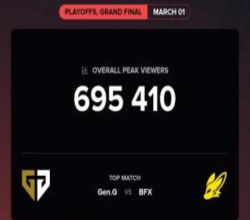 電競體育03月02報道 數(shù)據(jù)網(wǎng)站公布了昨日2026LCK Cup總決賽GEN vs BFX的直播熱度情況,本場Bo5觀眾峰值只有69.5w,連去年同期決賽熱度的一半都不到。