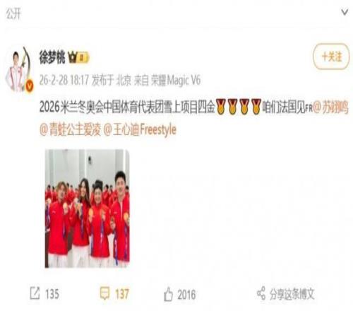 米蘭冬奧會(huì)四金得主!徐夢(mèng)桃曬與谷愛凌、蘇翊鳴、王心迪合照