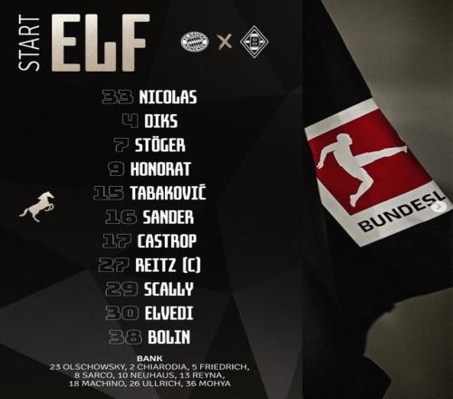 門興格拉德巴赫:33-莫里茨-尼古拉斯、4-凱文-迪克斯、30-尼科-埃爾維迪、16-桑德爾、17-卡斯特羅普、7-凱文-施特格爾、27-賴茨、29-約瑟夫-斯卡利、38-胡戈-博林、9-奧諾拉、15-哈里斯-塔巴科維奇
