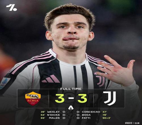 意甲第27輪,羅馬主場(chǎng)3-3戰(zhàn)平尤文,51分第四,尤文47分第六。韋斯利先拔頭籌,小孔塞桑超級(jí)世界波,恩迪卡建功,馬倫單刀破門加盟后7場(chǎng)6球,博加替補(bǔ)破門,加蒂替補(bǔ)絕平。