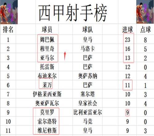射手榜方面,姆巴佩23球領(lǐng)跑,穆里奇16位列第2。亞馬爾上演帽子戲法后一舉超過托雷斯等人,13球升到第3。萊萬最后階段打入1球,11球位列第6。莫里羅今天未能進球,還是和維尼修斯,索爾洛特等9球剛好擠入前十。