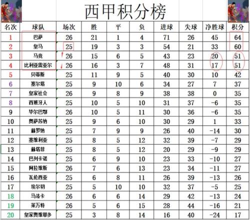 西甲最新積分戰(zhàn)報巴薩大勝多皇馬4分繼續(xù)領(lǐng)跑馬競小勝沖進前3