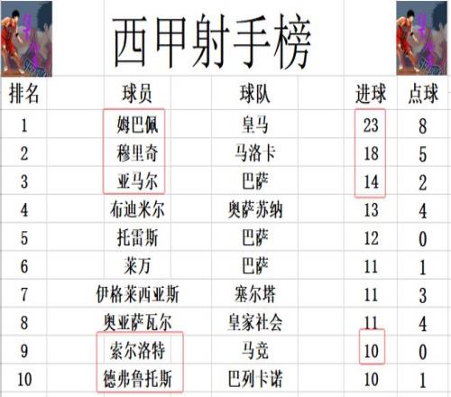 射手榜方面,姆巴佩23球領(lǐng)跑,穆里奇趁著姆巴佩傷缺緊追上來,今天梅開二度后將差距縮小到5球。亞馬爾打入制勝球,14球位列第3,布迪米爾13球排在第4。索爾洛特破門,追上德弗魯托斯,將前十門檻提高到10球。
