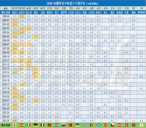 4、金黃色標注的數(shù)據(jù),表示一國出征歐冠小組賽(聯(lián)賽)球隊數(shù)量不低于3支,且全部晉級十六強的情況。