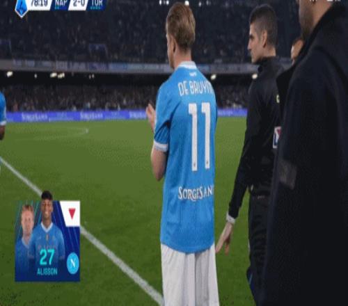 第79分鐘,換人調(diào)整,德布勞內(nèi)替補(bǔ)登場(chǎng),換下阿利松-桑托斯