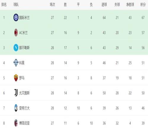 在積分榜上,國(guó)際米蘭依然遙遙領(lǐng)先,以67分高居榜首,戰(zhàn)績(jī)是22勝1平4負(fù)。排名第2的是AC米蘭,只拿到57分,足足落后10分。顯然,意甲的冠軍歸屬基本失去了懸念。衛(wèi)冕冠軍那不勒斯只拿到56分,排名第3??颇A球之后,總積分達(dá)到51分,升到了第4名。而同樣51分的羅馬掉到第5名。尤文圖斯50分,在爭(zhēng)四集團(tuán)中稍稍落后,排名第6。