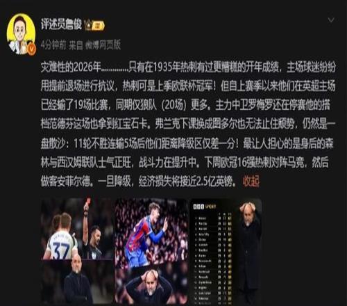 “災(zāi)難性的2026年..............只有在1935年熱刺有過更糟糕的開年成績,主場球迷紛紛用提前退場進(jìn)行抗議,熱刺可是上季歐聯(lián)杯冠軍!但自上賽季以來他們在英超主場已經(jīng)輸了19場比賽,同期僅狼隊(duì)(20場)更多?!?/p>