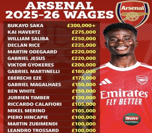 最近《太陽報(bào)》足球整理了阿森納新賽季的周薪單,薩卡、哈弗茨、薩利巴這些名字都在最頂一檔,賴斯、厄德高、熱...