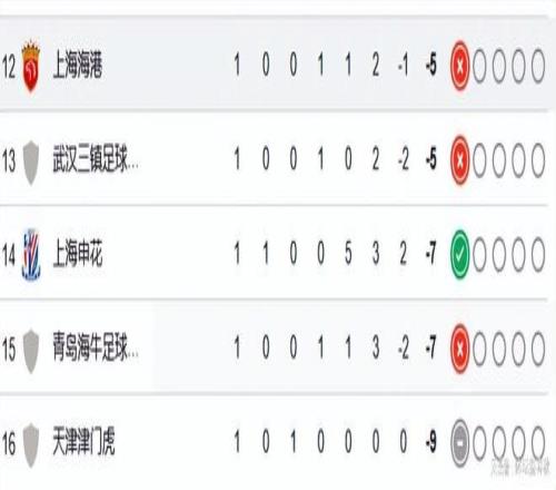 最后再來看一下積分榜榜尾的情況,天津津門虎本輪主場0-0戰(zhàn)平重慶銅梁龍,目前積-9分排名倒數(shù)第一。青島海牛客場1-3完敗云南玉昆,仍是-7分。目前上海申花也是-7分,因?yàn)閮魟偾虻年P(guān)系海牛排名倒數(shù)第二。而這3支球隊(duì)即便是后邊兩輪聯(lián)賽全部取勝,仍然無法將負(fù)分變正。